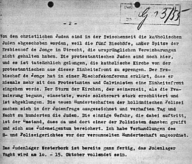 Diese Nöte müssen auch denen zur Kenntnis gebracht werden, die die Befehlsgewalt über diese Menschen ausüben: Darum hat sich der Hochwürdige Niederländische Episkopat in Vereinigung mit fast allen Kirchen in den Niederlanden an die Autoritäten der Besatzungsmacht gewandt; für die Juden unter anderem am Samstag, den 11. Juli des Jahres, in einem Telegramm folgenden Inhaltes:3